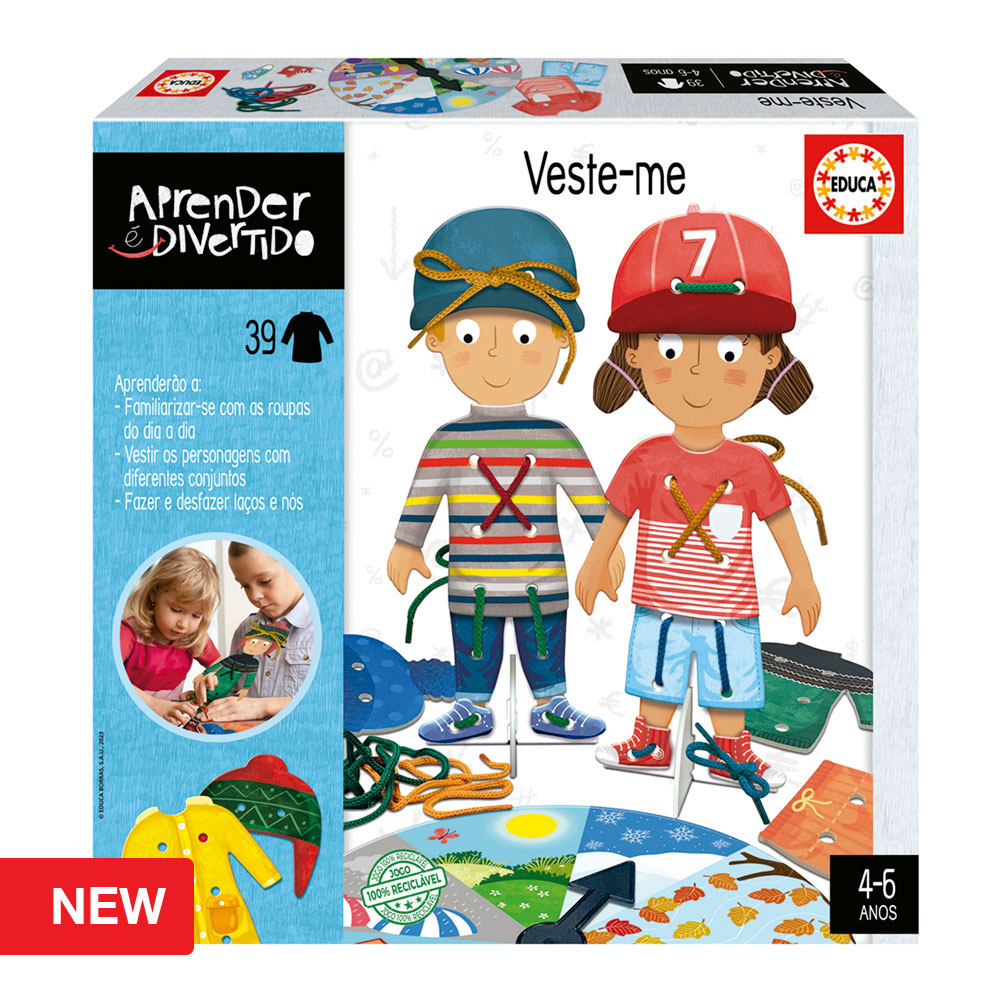 Com este divertido jogo, poderão vestir os personagens com diferentes peças de roupa, tendo em consideração o tempo ou atividade indicada na roleta. Treinarão a motricidade fina e adquirirão destreza e habilidade manual ao fazerem e desfazerem laços e nós.